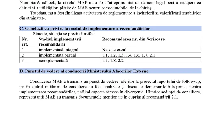 A existat şi un raport de foll0w-up din care reiese că MAE a implementat parţial şi chiar deloc măsurile lăsate de Curtea de Conturi la data la care a avut loc raportul.