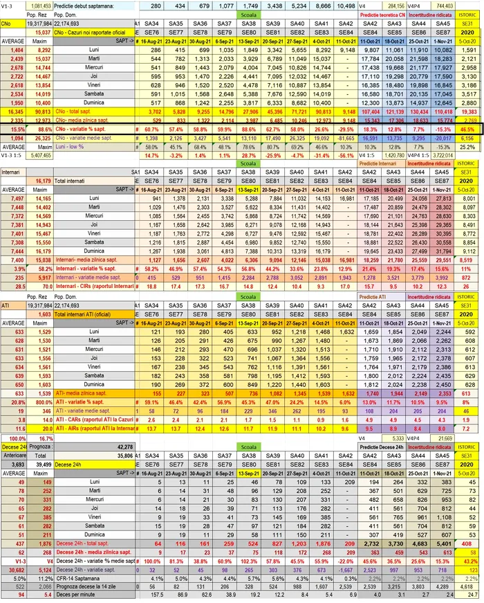 Biostatisticianul Octavian Jurma e de părere că săptămâna trecută ar putea fi ultima în care s-a manifestat o creștere accelerată a numărul de noi infectări și că „vârful” Valului 4 va fi atins la jumătatea lunii octombrie. Dr. Octavian Jurma se așteaptă ca numărul de cazuri noi să scadă începând de săptămâna aceasta, dar avertizează că situația de la ATI va rămâne una dificilă în următoarele 14 zile.