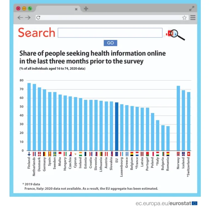 Finlandezii sunt foarte preocupați de căutarea informațiilor despre sănătate pe internet, cu un procent de 77% dintre cei cu vârsta între 16 și 74 de ani, urmați de olandezi (76%), danezi (72%) și germani (70%).