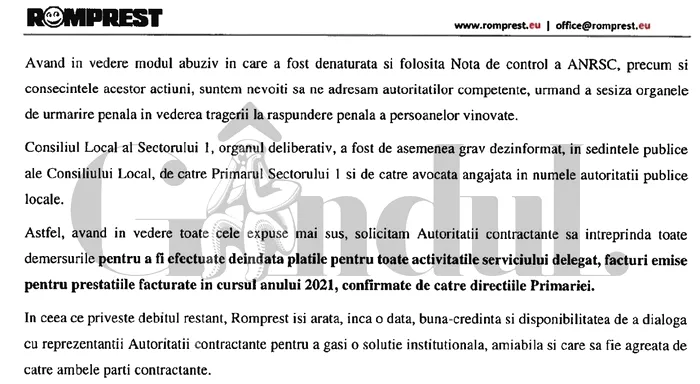 Potrivit acestei adrese, Consiliul Local al Sectorului 1 a fost dezinformat de Clotilde Armand, iar Romprest solicită Autorității contractante să întreprindă toate demersurile pentru a fi efectuate deîndată plățile pentru toate activitățile serviciului delegat, facturi emise pentru prestațiile facturate în cursul anului 2021, confirmate de către direcțiile Primăriei.