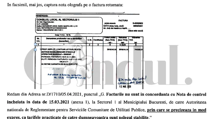 ”În răspunsul trimis de către ANRSC prin adresa 909178/11.06.2021 se arată că ”în ceea ce privește tarifele actuale practicate de societatea dumneavoastră (n.red. – Romprest), echipa de control, în cuprinsul Notei de control, nu a menționat nelegalitatea tarifelor aprobate de autoritatea deliberativă a Primăriei Sectorului 1 al Municipului București prin HCL 113/01.04.2019 de modificare a tarifelor pentru activitățile serviciului de salubrizare a localităților și aplicabile de la data semnării contractului adițional nr. 11 din 16.09.2019.