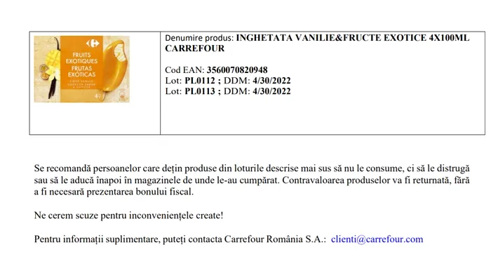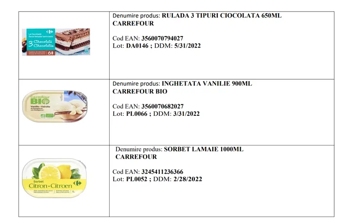 Potrivit unei informări a ANSVSA, ca urmare a notificării primite din partea furnizorului Froneri Ice Cream România SRL, Carrefour a început retragerea de la vânzare și rechemarea de la clienți a următoarelor articole: