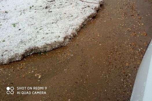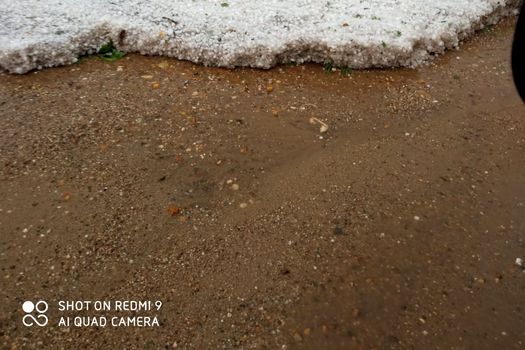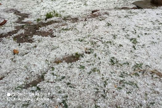 Localnicii spun că după ce s-a oprit grindina, pe marginea străzii au rămas nămeți de gheață, la fel ca după un vicol puternic.