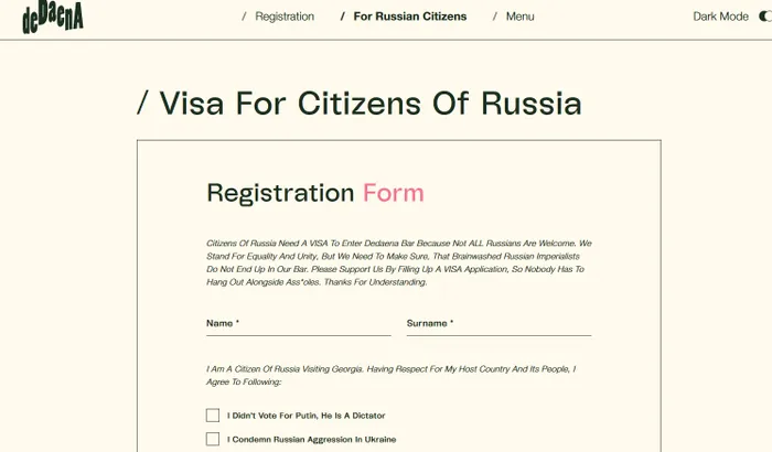 Vizitatorii sunt rugați să nu vorbească în limba rusă sau „să se implice în discuții politice, în timp ce se află în stare de ebrietate”, relevă formularul online.
