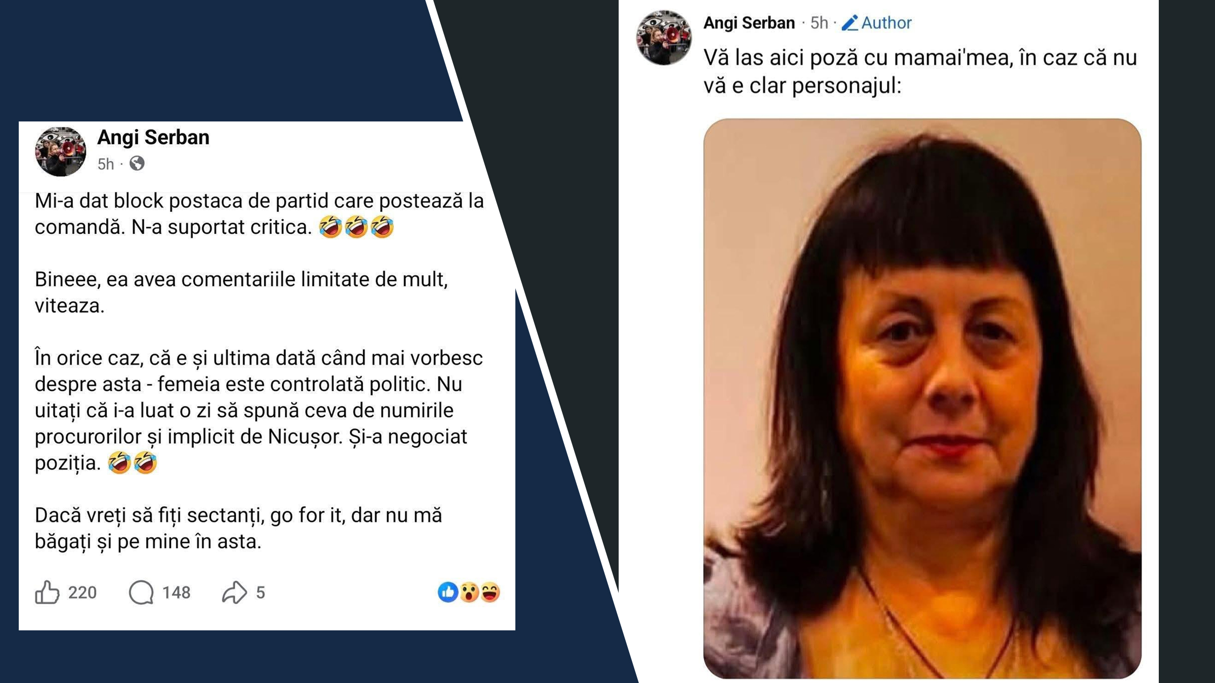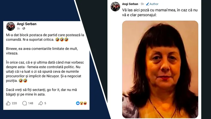 „Mi-a dat block postaca de partid care postează la comandă. N-a suportat critica. Bineee, ea avea comentariile limitate de mult, viteaza. În orice caz, că e și ultima dată când mai vorbesc despre asta – femeia este controlată politic. Nu uitați că i-a luat o zi să spună ceva de numirile procurorilor și implicit de Nicușor. Și-a negociat poziția. Dacă vreți să fiți sectanți, go for it, dar nu mă băgați și pe mine în asta”, a scris Angi Șerban pe pagina sa de Facebook.