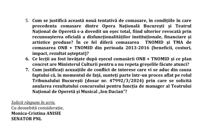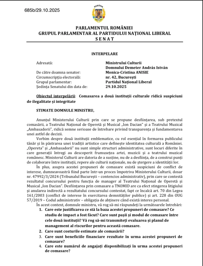 Monisa Anisie, senator PNL, a făcut o interpelare către ministrul Culturii cu privire la comasarea Teatrului Național de Opereră și Musical Ion Dacian și a  Teatrului Muzical Ambasadorii, precizând că ridică semne serioase de întrebare, privind transparența și fundamentarea unei astfel de decizii.