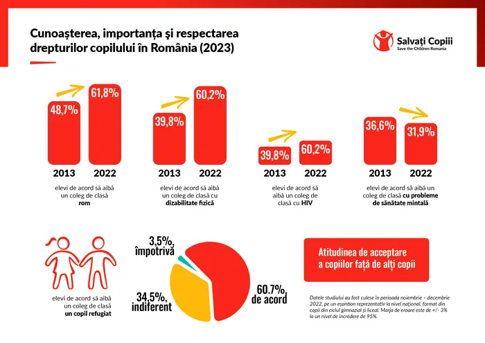 Datele amplei anchete Salvați Copiii România, care măsoară felul în care copiii își cunosc drepturile pe care le au și mecanismele de protecție ale acestora, au fost culese în perioada noiembrie – decembrie 2022, pe un eșantion reprezentativ la nivel naţional, format din copii din ciclul gimnazial și liceal. Marja de eroare este de +/- 3% la un nivel de încredere de 95%.