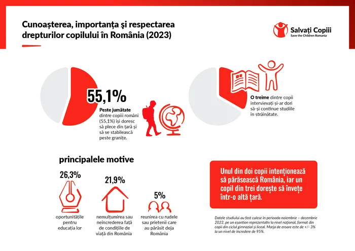 Printre principalele motive care i-ar determina să emigreze se numără oportunitățile legate de educație (26,3%) și nemulțumirea sau neîncrederea față de condițiile de viață din România (21,9%), arată datele unei anchete sociologice derulate de Organizația Salvați Copiii România.