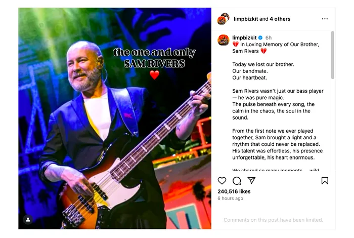 „Astăzi ne-am pierdut fratele. Colegul nostru de trupă. Inima noastră,. Sam Rivers nu era doar basistul nostru — era magie pură. Pulsul din spatele fiecărui cântec, liniștea din haos, sufletul din sunet”, a scris trupa într-o postare pe Instagram.