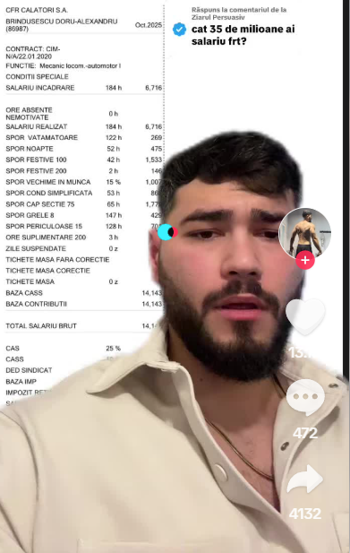 Gestul său a venit ca răspuns la ironiile primite în mediul online, printre care și întrebarea: „Cât 35 de milioane ai salariu, frate?”, fapt care l-a determinat pe Brândușescu Doru-Alexandru să arate realitatea din spatele veniturilor unui mecanic de locomotivă în 2025.