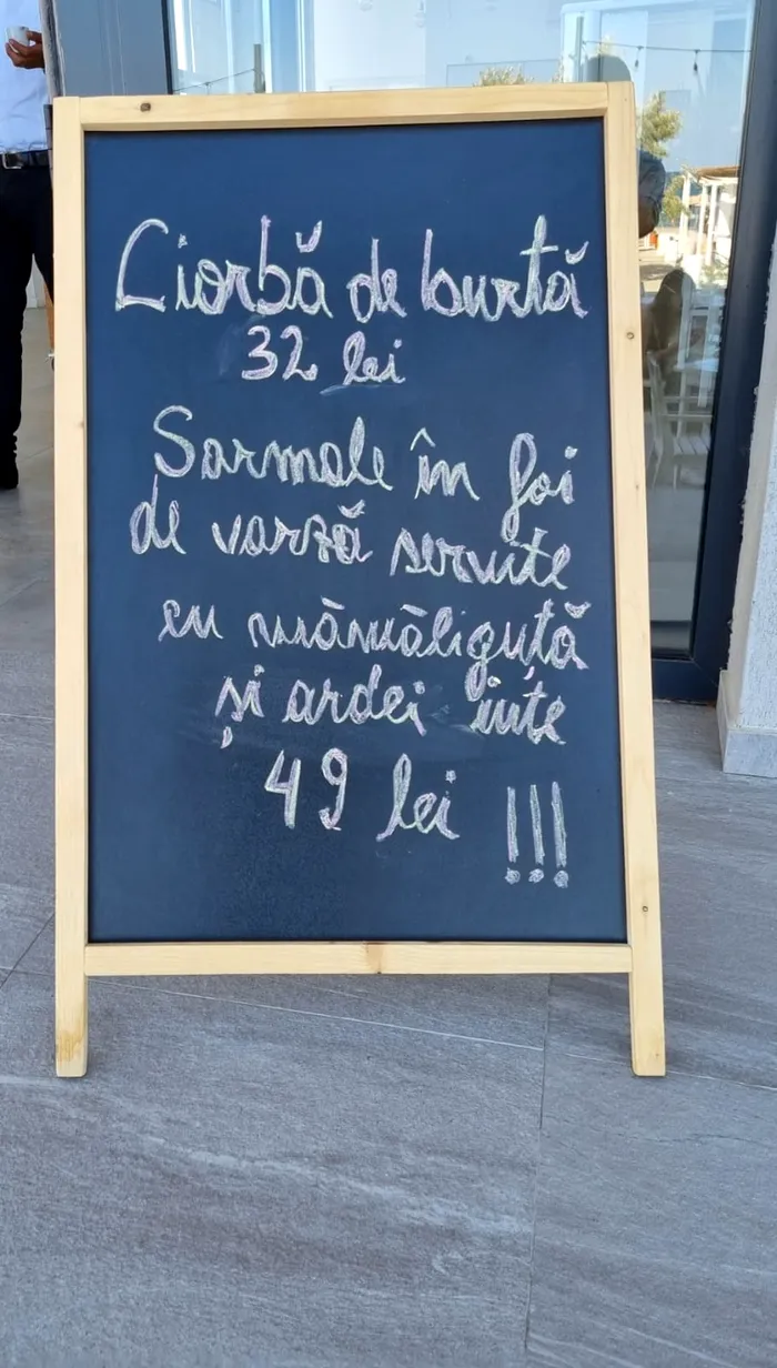Astfel, potrivit imaginii, o banală ciorbă de burtă costă 32 de lei, iar o porție de sarmale cu mămăliguță costă nu mai puțin de 49 de lei.