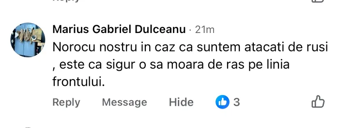 Și nu a scăpat nici Ministrul Apărării, Ionuț Moșteanu. Într-un alt comentariu, un internaut povestește despre defășurarea exercițiului, firește ironic. Practic, totul e de fapt un concurs de tras cu carbit combinat cu o cursă de trotinete. Totul pentru ca la finalul cursei să fie dezvăluit un bust al Ministrului Moșteanu.