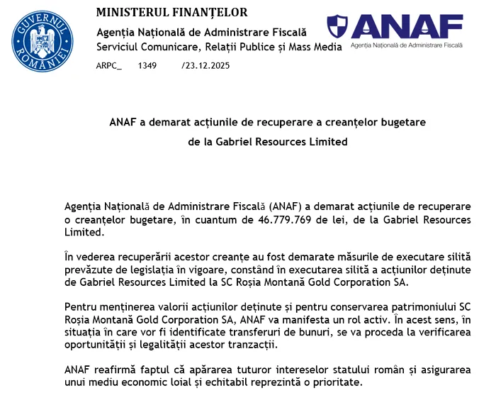ANAF a început să ceară de la Gabriel Resources Limited suma de 46.779..769 lei care reprezintă datoriile la stat. Pentru a recupera banii, agenția va vinde acțiunile pe care compania canadiană le deține la SC Roșia Montană Gold Corporation. ANAF va urmări ca toate tranzacțiile să fie legale și să protejeze valoarea acțiunilor și patrimoniul companiei.