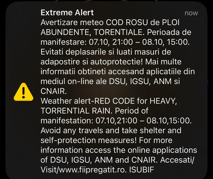 Update: Așa cum a anunțat Raed Arafat, șeful DSU, a apărut și mesajul de RO-Alert.