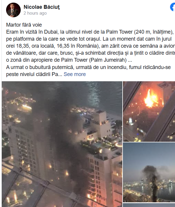„Am zărit ceva ce semăna a avion de vânătoare, dar care, brusc, și-a schimbat direcția și a țintit o clădire dintr-o zonă din apropiere de Palm Tower (Palm Jumeirah)”, a scris acesta pe contul de Facebook.