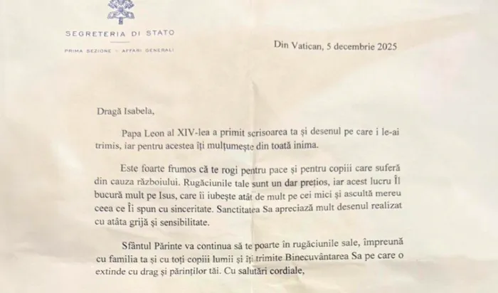 „Rugăciunile tale sunt un dar prețios, iar acest lucru Îl bucură mult pe Isus, care îi ascultă mereu pe cei mici și ascultă mereu ceea ce Îi spun cu sinceritate. Sanctitatea Sa apreciază mult desenul realizat cu atâta grijă și sensibilitate”, sunt cuvintele prin care papa Leon al XIV-lea a răspuns la scrisoarea și desenul pe care o fetiță din București i le-a transmis în luna septembrie 2025.