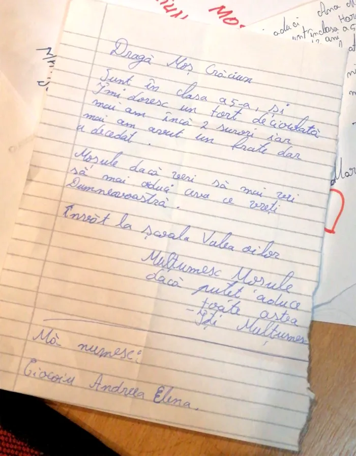 „Dragă Moș Crăciun, sunt în clasa a 5-a și îmi doresc un tort de ciocolată. Mai am încă două surori și am mai avut un frate, care a decedat.