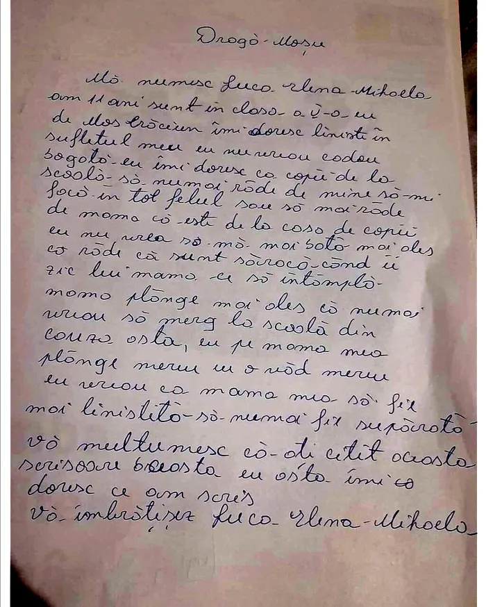 „Mă numesc Elena Mihaela, am 11 ani și sunt în clasa a V-a. În doresc liniște în sufletul meu. Nu vreau cadouri. Îmi doresc ca cei de la școală să nu mai râdă de mine, să mă facă în tot felul și să zică de mama mea că e de la casa de copii. Nu vreau să mă mai bată fiindcă sunt săracă. Când îi zic mamei ce se întâmplă, ea plânge. Eu nu îmi doresc să mai merg la școală din cauza asta. Eu vreau ca mama mea să fie liniștită, să nu mai fie supărată. Mulțumesc că ai citit această scrisoare. Te îmbrățișez, Elena Mihaela”.