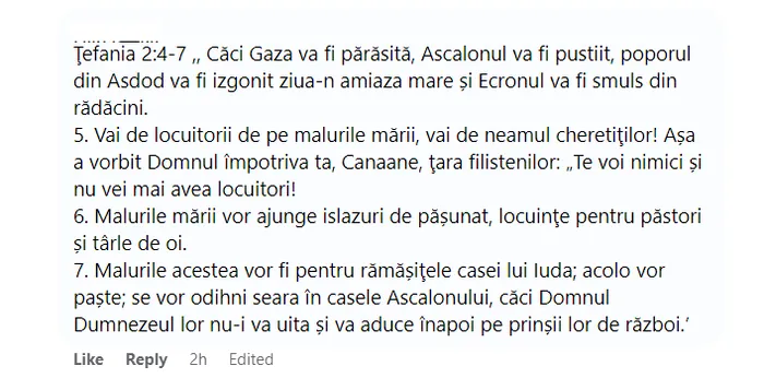 7. Malurile acestea vor fi pentru rămășitele casei lui Iuda; acolo vor paște; se vor odihni seara în casele Ascalonului, căci Domnul Dumnezeul lor nu-i va uita și va aduce înapoi pe prinșii lor de război”, este mesajul postat pe rețeaua de socializare.
