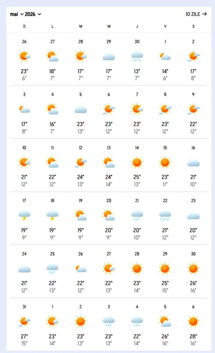 După 24-25 mai, vremea intră într-un trend clar de încălzire. Maximele cresc progresiv de la 22°C la 25-26°C spre finalul lunii, iar minimele ajung la 14-16°C. Zilele devin predominant însorite, iar episoadele de ploaie sunt rare și slabe.