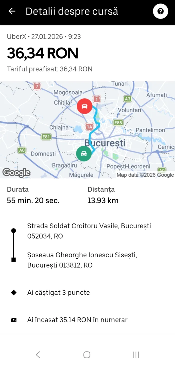 Cursa de 55 de minute, din cartierul Rahova până în Șoseaua Gheorghe Ionescu Sisești, a făcut 36,34 de lei.