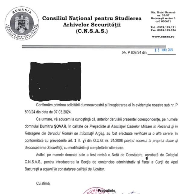 „… vă aducem la cunoștință că, anterior derulării prezentei corespondențe, pe numele domnului Dumitru ȘOVAR, în calitate de Președinte al Asociației Cadrelor Militare în Rezervă și în Retragere din Serviciul Român de Informații Argeș, au fost efectuate verificări la o altă cerere, în conformitate cu prevederile art. 3 lit. y) din O.U.G. nr. 24/2008 privind accesul la propriul dosar și deconspirarea Securității, cu modificările și completările ulterioare.