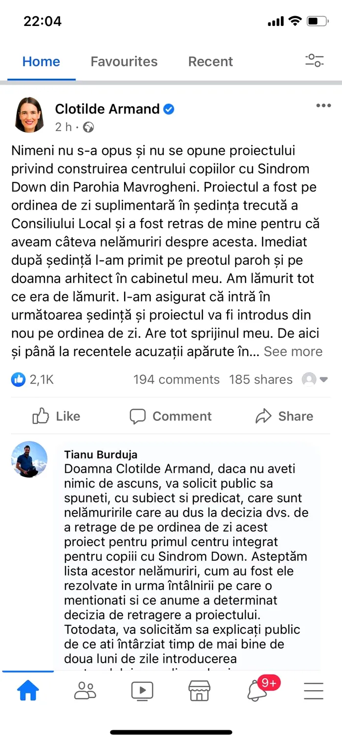 Doamna Clotilde Armand, dacă nu aveți nimic de ascuns, vă solicit public să spuneți, cu subiect si predicat, care sunt nelămuririle care au dus la decizia dumneavoastră de a retrage de pe ordinea de zi proiectul pentru primul centru integrat pentru copiii cu Sindrom Down, îi răspunde liderul PNL Sector 1, Sebastian Burduja, primarului Sectorului 1 la mesajul pe Facebook scris de Clotilde Armand pe acest subiect.