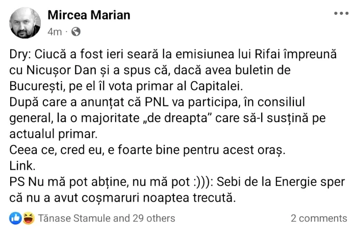 Jurnalistul Mircea Marian a subliniat într-o postare pe Facebook această poziție surprinzătoare a liderului liberal, menționând că Ciucă a anunțat și sprijinul PNL pentru o „majoritate de dreapta” în Consiliul General, care să-l susțină pe Nicușor Dan.