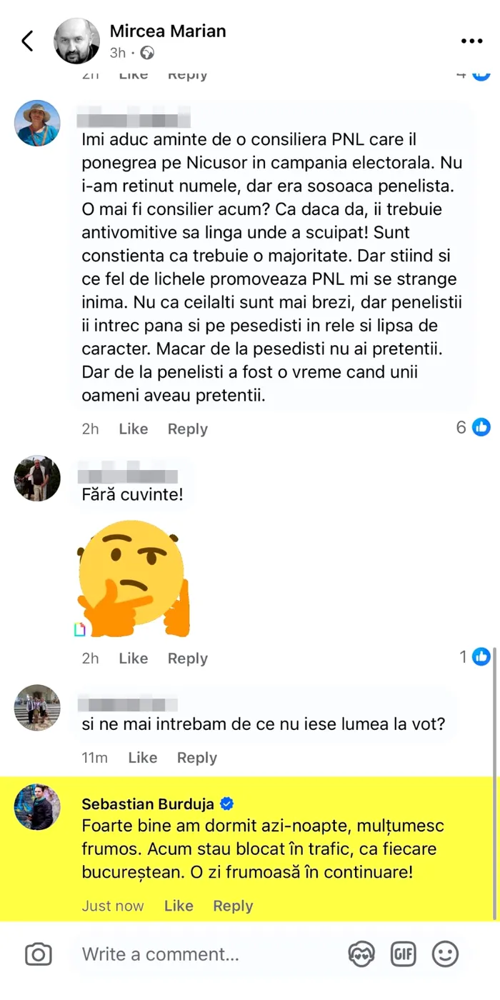 În replică, Sebastian Burduja a răspuns printr-un comentariu la postare pe un ton relaxat: