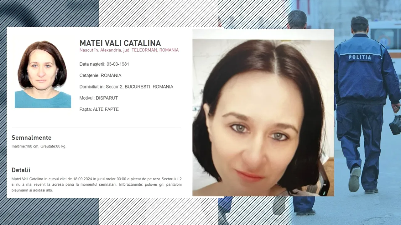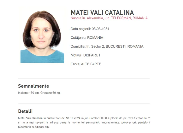 „Astăzi, 18 septembrie 2024, Poliţia Capitalei a fost sesizată cu privire la dispariţia unei femei care a plecat în cursul acestei dimineţi de la adresa de domiciliu din Sectorul 2 şi nu a mai revenit până în prezent. Persoana dispărută se numeşte Matei Vali Cătălina, este în vârstă de 43 de ani”, a transmis, miercuri, Poliţia Capitalei.