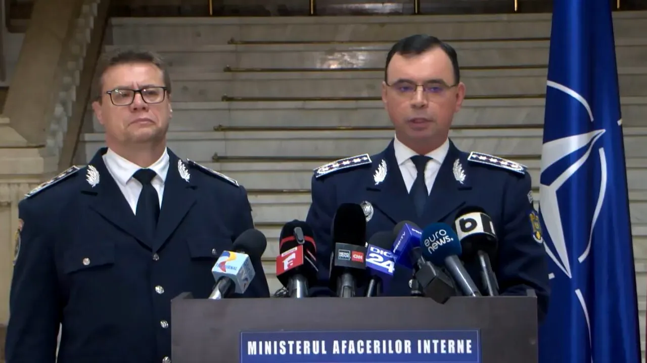 Secretarul de stat Bogdan Despescu și Inspectorul General al Poliției Române, Benone Marian Matei, susțin declarații de presă la sediul Ministerului Afacerilor Interne, după acțiunea colegilor din Olanda în cazul jafului de la muzeul în care erau expuse piese de tezaur din România.