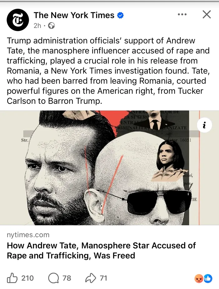 Sub titlul „Cum a fost eliberată o vedetă Manosphere acuzată de viol și trafic de persoane”, mai mulți jurnaliști The New York Times relatează, într-o documentare amplă, detalii inedite despre eliberarea intempestivă din România a fraților Tate – Andrew și Tristan – și plecarea lor în Florida în februarie 2025.