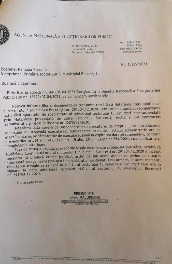 Pe 14 aprilie, Agenția Națională a Funcționarilor Publici (ANFP) a transmis un răspuns oficial la solicitarea formulată de consilierii PNL Sector 1, prin viceprimarul Ramona Porumb, cu privire la legalitatea proiectului de buget pentru 2021. ANFP, sub semnătura președintelui Liviu Mălureanu, confirmă că decizia instanței este executorie de drept, fiind obligatorie revenirea la situația anterioară HCL-ului suspendat.