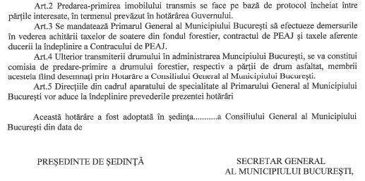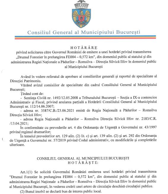 ”Se solicită Guvernului României emiterea unei hotărâri privind transmiterea ‘Drumului Forestier în prelungirea FE004 – 0,572 km’ din domeniul public al statului şi din administrarea Regiei Naţionale a Pădurilor – Romsilva – Direcţia Silvică Ilfov în domeniul public al Municipiului Bucureşti, în vederea creării unei artere (…) deschise circulaţiei publice”, se menționează în proiectul de act normativ propus spre adoptare de consilieri generali ai PSD.