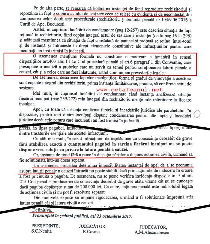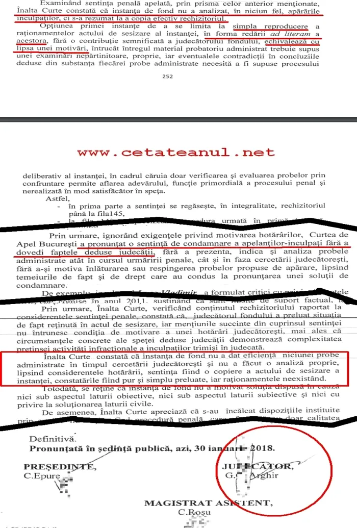 În acele cazuri, instanța supremă a stabilit că a fost încălcat dreptul la un proces echitabil: ”Hotărârea instanţei de fond reproduce rechizitoriul şi reprezintă în fapt o copie a actului de sesizare ceea ce reiese cu evidenţă şi de necontestat din compararea celor două acte procedurale ale Curţii de Apel Bucureşti (…) Motivarea soluţiei pronunţate de instanţa de judecată constituie o îndatorire care înlătură orice aspect discreţionar în realizarea justiţiei. (…) Dreptul la un proces echitabil garantat de art. 6 din Convenţie (n.red. – Convenția privind drepturile omului)”, au spus tranșant judecătorii Curții.