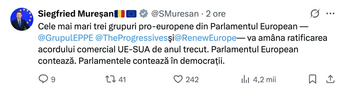 „Cele mai mari trei grupuri pro-europene din Parlamentul European — Grupul PEE, The Progressives și Renew Europe — vor amâna ratificarea acordului comercial UE-SUA de anul trecut. Parlamentul European contează. Parlamentele contează în democrații”, scrie Mureșan.