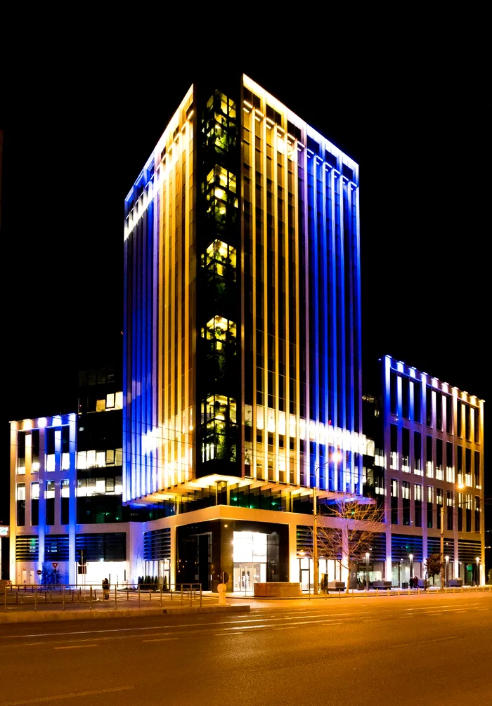 Mediul economic reacționează prompt pe tema conflictului armat din Ucraina. Țiriac Tower, clădirea etalon a diviziei imobiliare a Grupului Țiriac, este iluminată în culorile drapelului ucrainean, de vineri 25 februarie, chiar în inima Bucureștiului.