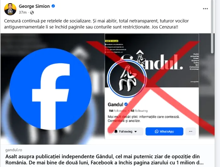 Președintele AUR, George Simion, critică abuzul Facebook asupra publicației Gândul. Liderul naționalist consideră că este vorba de un act de cenzură care, din punctul său de vedere, face parte dintr-o campanie mai amplă exercitată asupra mass-media de opoziție din România.