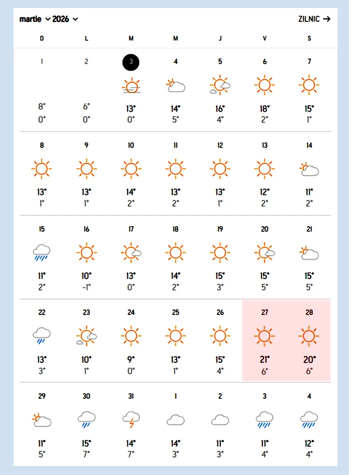 Pentru Calafat, așa cum se vede și în poza de mai jos, prognoza indică două zile cu temperaturi de primăvară târzie: pe 27 martie sunt estimate 21 de grade, iar pe 28 martie, aproximativ 20. Restul lunii se menține, în general, cu maxime cuprinse între 10 și 18 grade Celsius, în timp ce minimele nocturne rămân scăzute, apropiindu-se, pe alocuri, de pragul înghețului.