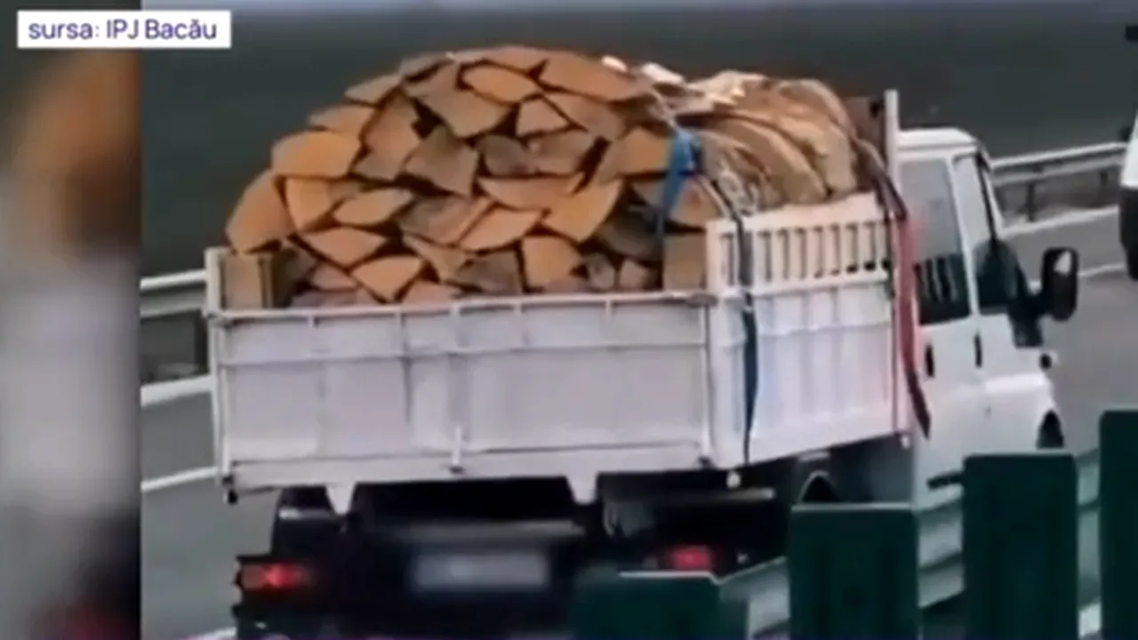Imaginile șocante au fost surprinse pe centura care ocolește orașul Bacău. Pe filmarea făcută de un șofer de TIR se observă că o camionetă încărcată cu lemne circulă pe contrasens pe autostrada A7, potrivit B1 TV.