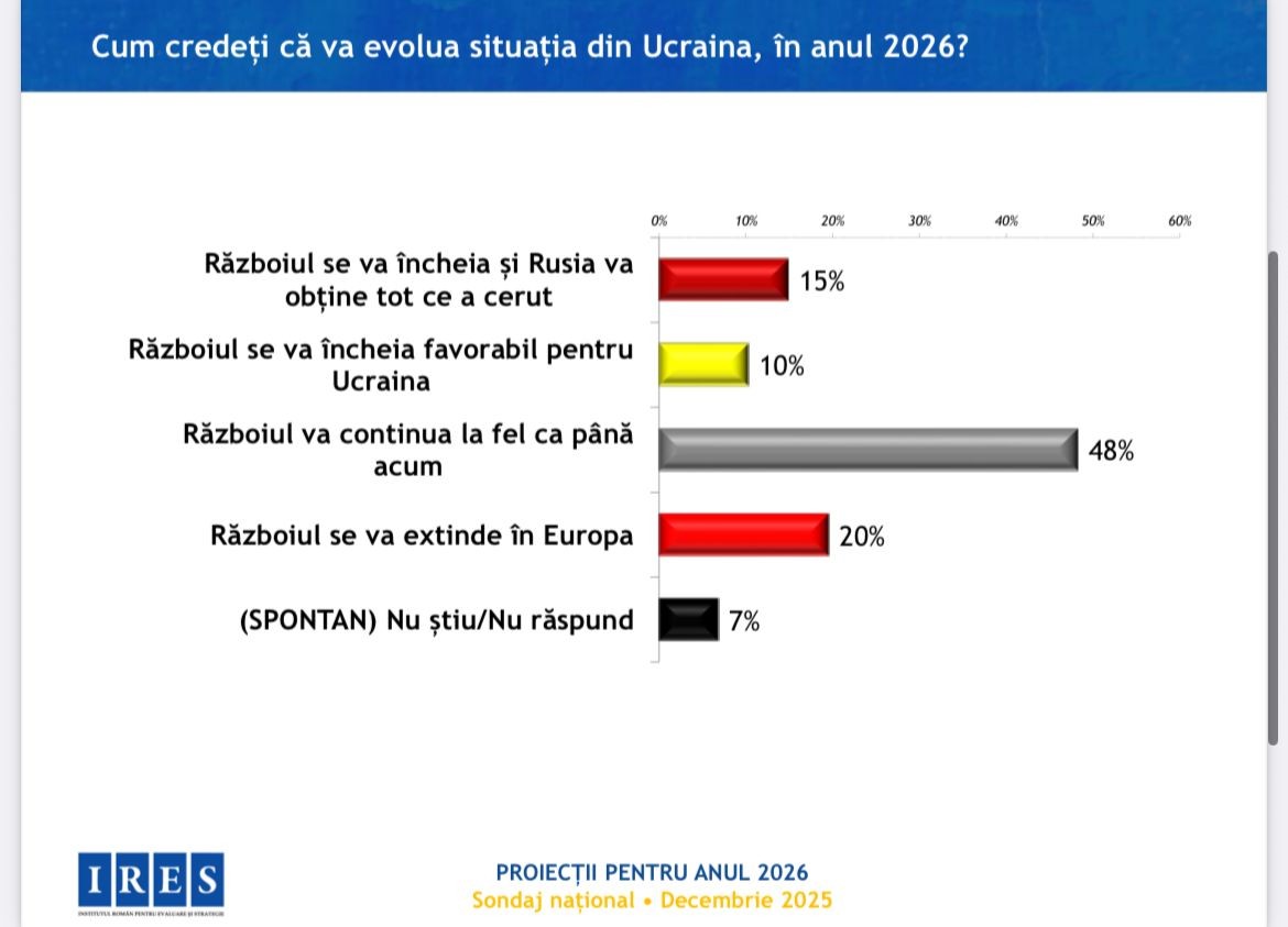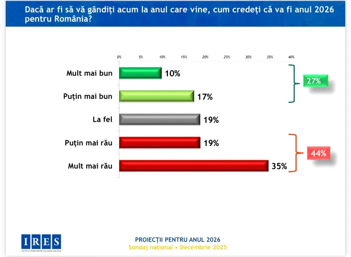 La nivel național, aproape jumătate dintre români se așteaptă ca 2026 să fie un an mai rău pentru România, iar doar un sfert cred într-o evoluție pozitivă.
