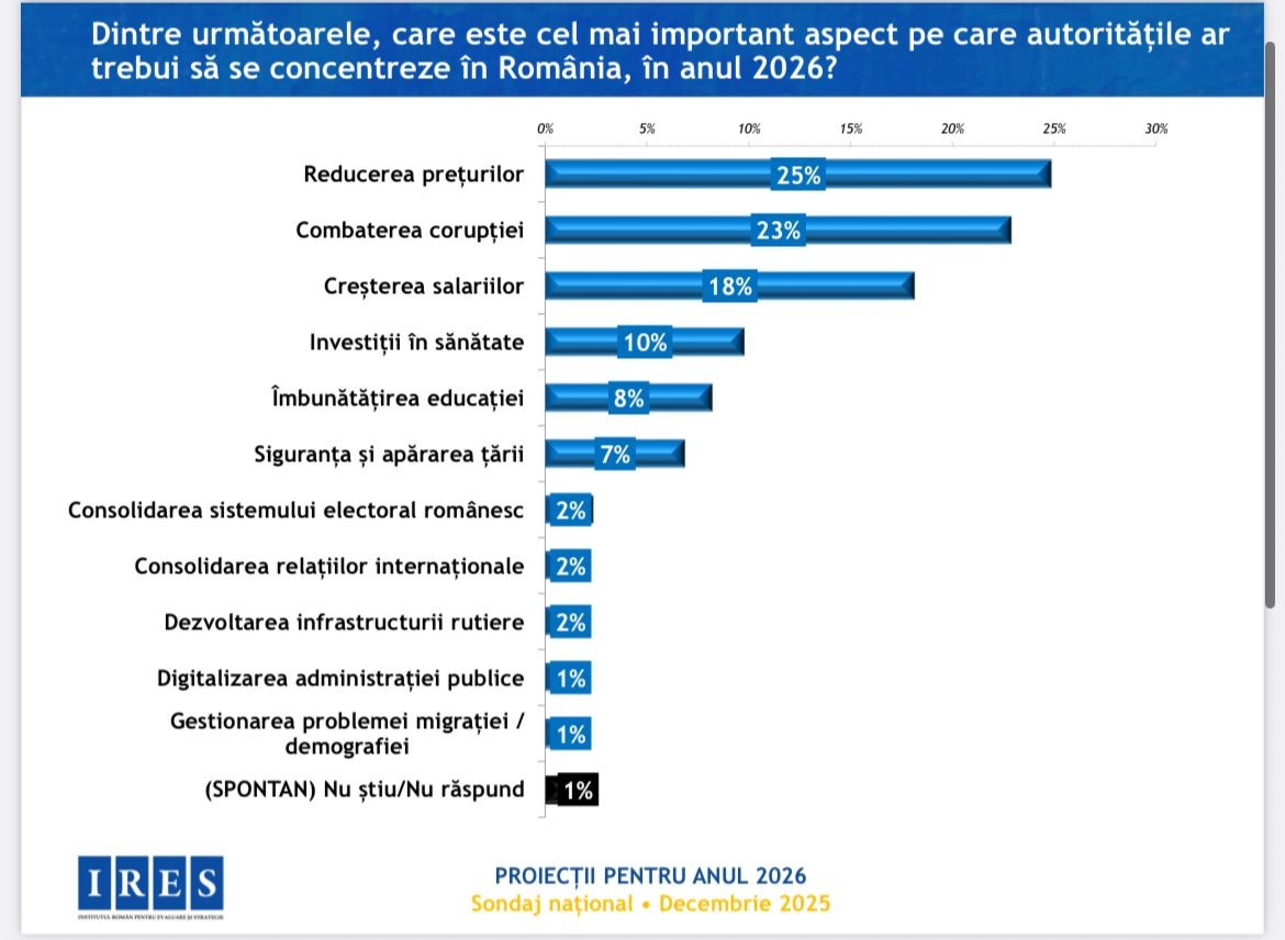 Românii nu cer transformări spectaculoase, ci stabilitate, predictibilitate și reducerea costurilor de trai. Dacă 2025 a fost un an al adaptării și rezistenței, 2026 este perceput ca un an al speranței prudente, condiționată de condiții externe și interne favorabile.