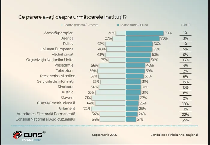 Procente de și peste 50% primesc și entități precum Uniunea Europeană(55%), ONU(50%), iar mediul privat își adjudecă 52% dintre sufragii, potrivit aceluiași sondaj CURS.