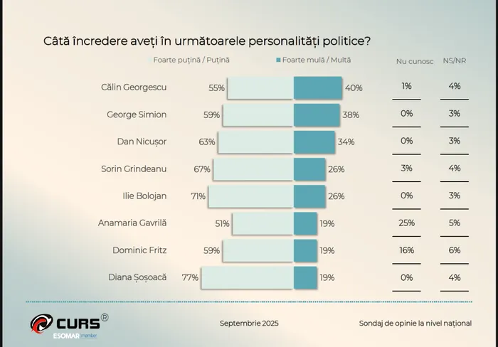 Liderul interimar al PSD,  Sorin Grindeanu este umăr la umăr cu premierul Ilie Bolojan, creditați de români cu 26%. Liderul POT,  Anamaria Gavrilă, șeful USR-Dominic Fritz și președinta SOA-Diana Șoșoacă au fiecare câte 19%.