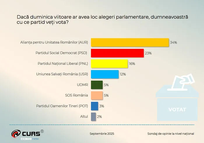 Răspunsurile a 1.100 de români au adus AUR la 34%, în septembrie, după ce, în mai, partidul înregistra 35%, iar în iulie-38%. PSD, însă, are o revenire de 3%, după un 24% în mai, un 20% în iulie. Acum a recuperat trei procente, din cele patru pierdute anterior.