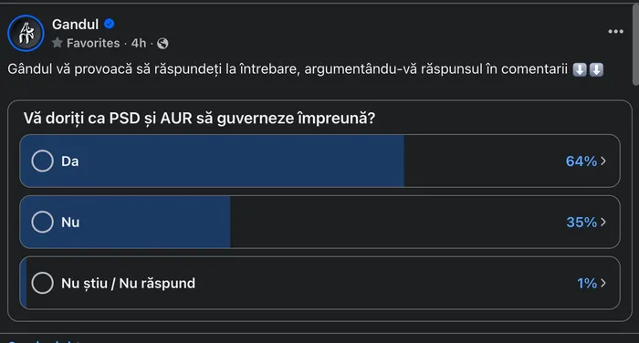 Gândul a lansat un sondaj pe pagina de Facebook în care a întrebat cititorii dacă sunt de acord cu guvernarea PSD AUR. Rezultatul celor peste 2.700 de respondenți a fost surprinzător.
