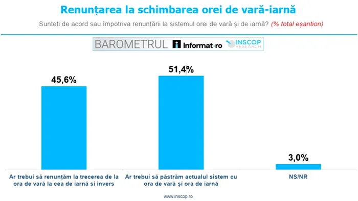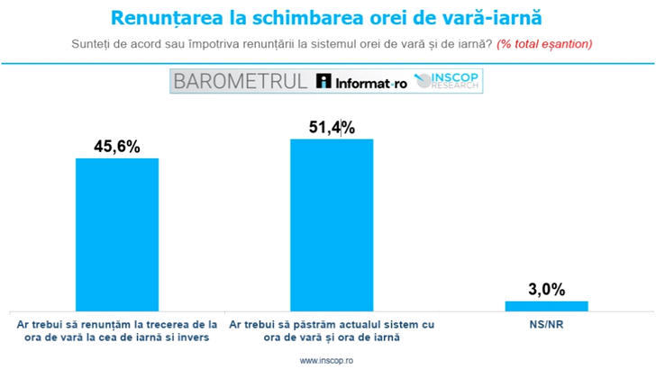 Conform sondajului INSCOP Research, 51,4% dintre cei chestionați consideră că ar trebui păstrat actualul sistem cu ora de vară și ora de iarnă, în timp ce 45,6% sunt de părere că ar trebui să renunțăm la acest obicei.