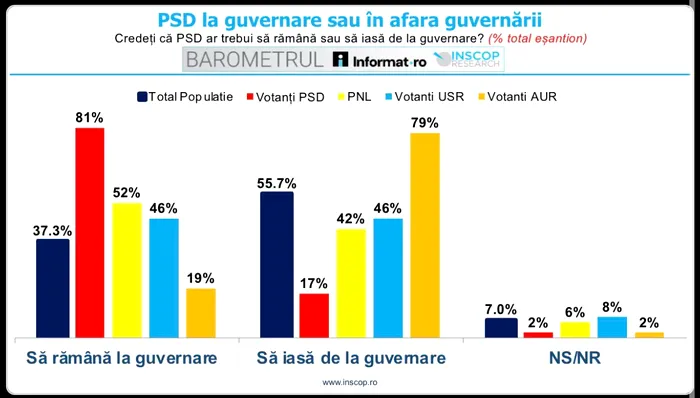 Potrivit datelor, 55,7% din totalul respondenților își doresc ca PSD să iasă de la guvernare, în timp ce 37,3% cred că partidul ar trebui să rămână la putere, iar 7% nu au oferit un răspuns sau nu știu ce poziție să adopte. De asemenea, 81% dintre votanții PSD consideră că formațiunea ar trebui să rămână la guvernare, în timp ce doar 17% dintre aceștia cred că partidul ar trebui să iasă din Executiv.