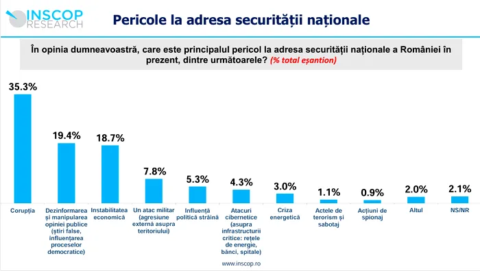 Cei mai mulți dintre respondenți, 35.3%, consideră că principalul pericol la adresa securității naționale a României este corupția. Alți 19.4% indică dezinformarea și manipularea opiniei publice (știri false, influențarea proceselor democratice), 18.7% instabilitatea economică, 5.8% un atac militar (agresiune externă asupra teritoriului), iar 5.3% influența politică străină. De asemenea, 4,3% dintre români se tem de atacurile cibernetice, 3% de criza energetică, 1,1% de actele de terorism și sabotaj, 0,9% de acțiunile de spionaj, iar 2% precizează alt pericol.