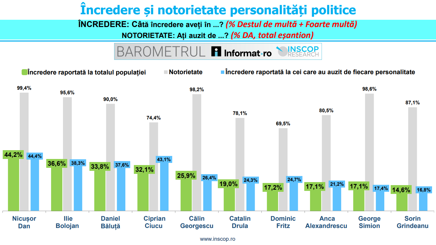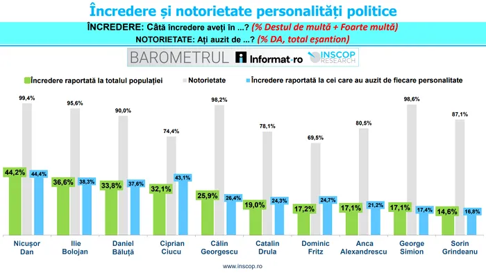 • Datele reflectă nivelul de încredere al bucureștenilor în fiecare personalitate politică, dar și nivelul de încredere al celor care au auzit de fiecare personalitate, în condițiile în care notorietatea diferă de la persoană la persoană. Personalitățile cu nivel de notorietate mai mică beneficiază, firesc, de un nivel de încredere mai mic raportat la totalul populației pentru că baza lor de raportare este mai mică. În ceea ce privește personalitățile care candidează la alegerile pentru primar al Capitalei, este important de precizat că aceste date nu reflectă fidel intenția de vot. Dacă întrebarea privind intenția de vot are variante exclusive, adică respondenții pot opta pentru un singur candidat, întrebările privind încrederea sunt distincte, același respondent putând avea încredere în mai multe personalități fie din același spectru politic, fie, ceva mai rar, din zone diferite”, explică directorul institutului, Remus Ștefureac.